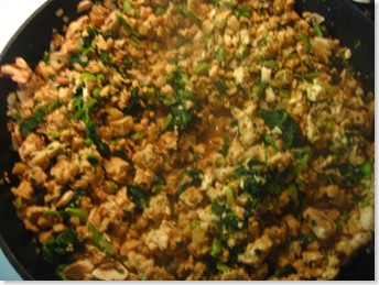 4. Add chicken/tofu/edamame mix to pan and cook, stirring for about 10 min.